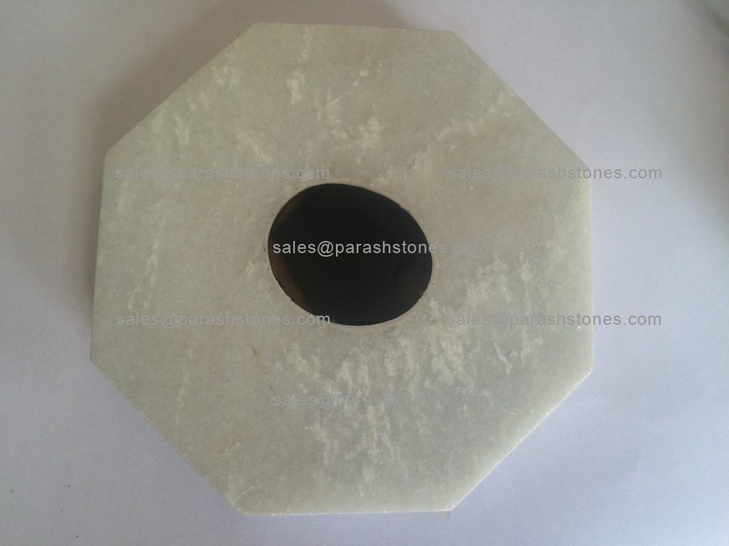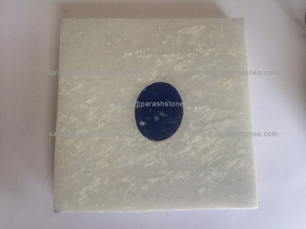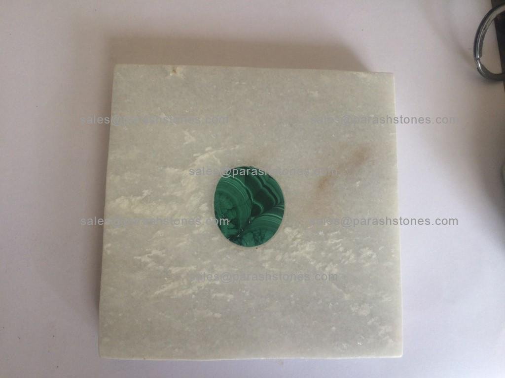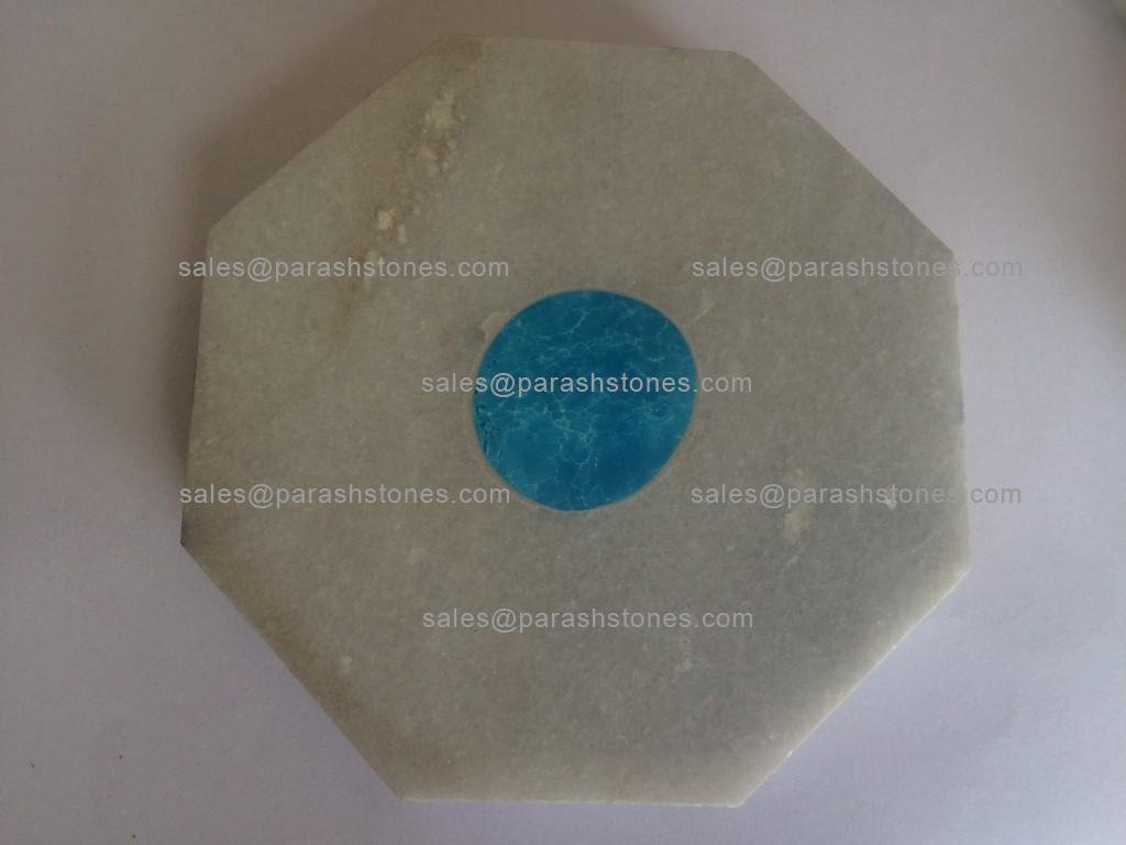 Marble coasters with semi precious inlay in malachite, lapis, tiger eye, turquoise, shell. All shapes round, hexagon & square. Under manufacturing 80,000 pieces for a hotel chain project.