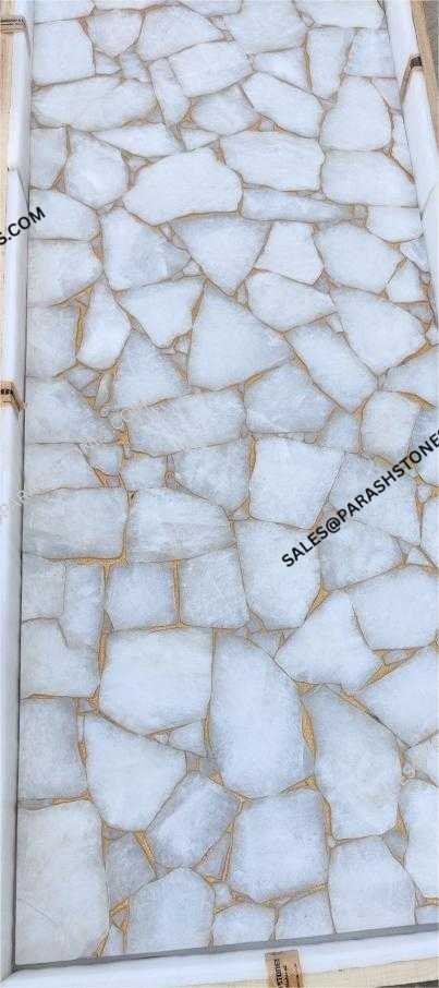 White Quartz With Gold Fill is an exquisite semi-precious surface that achieves a spectacular visual contrast. It utilizes the pristine purity of white quartz crystals, which are meticulously pieced together, with the interstitial spaces filled with striking golden resin or material. This unique process creates luminous surfaces where the elegant white quartz is segmented and highlighted by veins of shimmering gold.